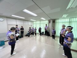 団地内にある広い控え室で打ち合わせ。今日はいつも通りの演目ですけども、とにかく暑いのでそれぞれが自分の体調と向き合いながら、演奏をやり遂げましょう!と暑さへの気遣いを忘れないことも目標です。
