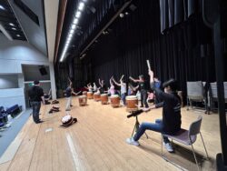 そしてこちらの会場では、舞台と舞台前との両方を使っての演奏となるので、いつもと違う太鼓移動を頭に入れておかねばなりません。念入りに各演目ごとのフォーメーションを確認し、いざ本番へ!!